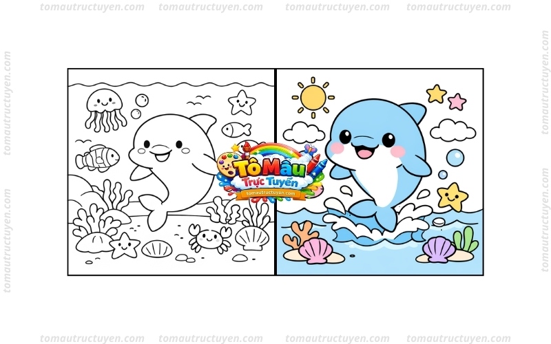 - Tô màu lần lượt các phần như thân cá heo, sóng nước, san hô, sao biển hoặc những chi tiết trang trí xung quanh để bức tranh thêm sinh động.