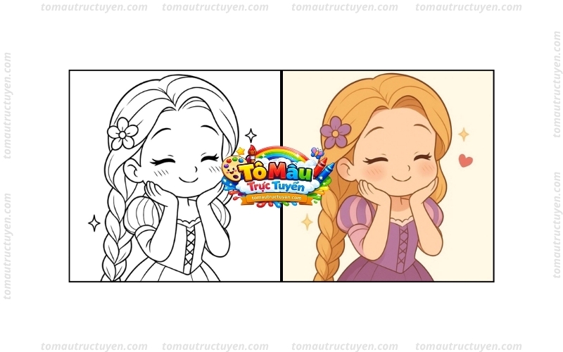 Bộ sưu tập dưới đây tổng hợp những hình ảnh công chúa Tóc Mây được yêu thích với nhiều phong cách khác nhau. Chỉ cần chọn bức tranh mà bé thích và nhấn vào, hệ thống sẽ tự động chuyển sang giao diện tô màu trực tuyến, giúp bé trải nghiệm sáng tạo dễ dàng ngay trên màn hình mà không cần in ấn.
